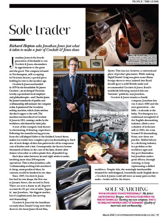 Jonathan Jones is the fourth generation of his family to run Crockett & Jones, shoemakers by appointment to the great and the good. The company is based in Northampton, still occupying its Victorian factory, a period piece holding its own in the modern age.