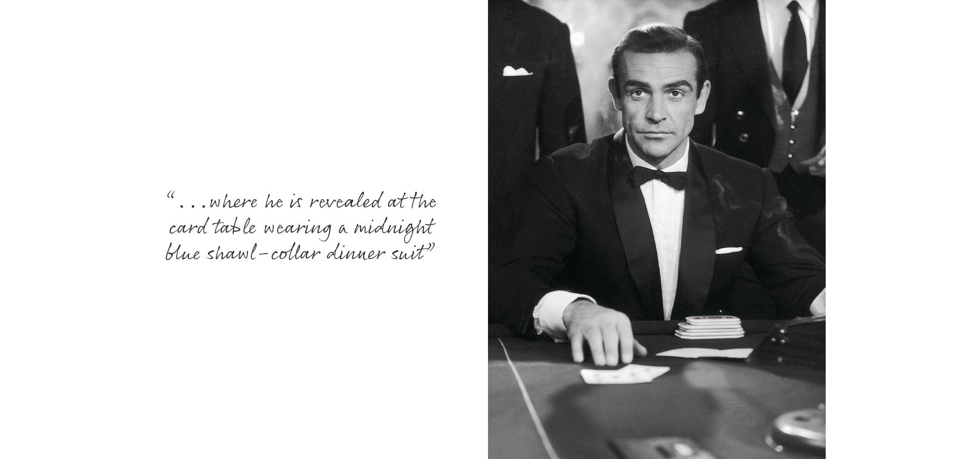 Consider Sean Connery’s introduction to cinema audiences at the casino in Dr No where he is revealed at the card table wearing a midnight blue shawl-collar dinner suit, or the scene in Goldfinger where he strips off a waterproof suit to reveal a pristine white dinner jacket underneath.