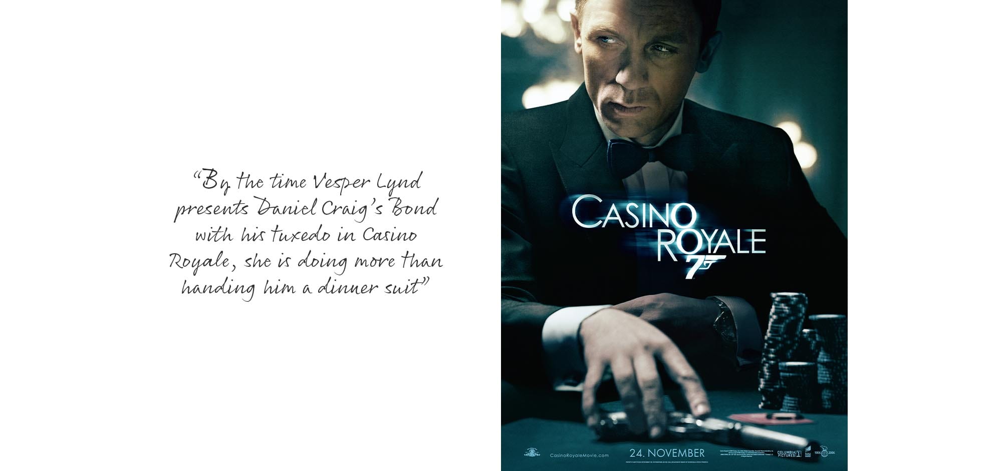 It was The Spy Who Loved Me that introduced the tux to the 007 films’ gun-barrel sequence, which further boosted Bond’s evening wear as his signature look. By the time Vesper Lynd presents Daniel Craig’s Bond with his tuxedo in Casino Royale, she is doing more than handing him a dinner suit.