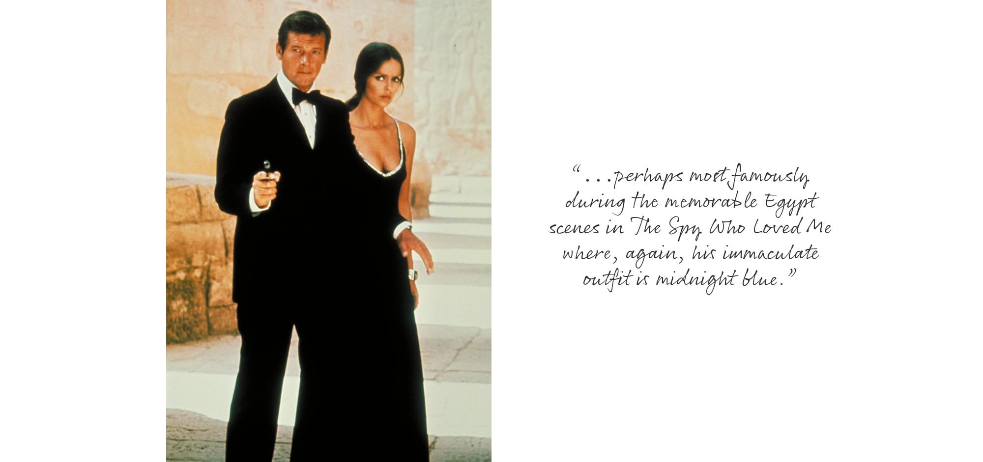 Roger Moore, working through the 1970s and early 1980s was subject to different trends but he too always wore his tux with panache — perhaps most famously during the memorable Egypt scenes in The Spy Who Loved Me where, again, his immaculate outfit is midnight blue.