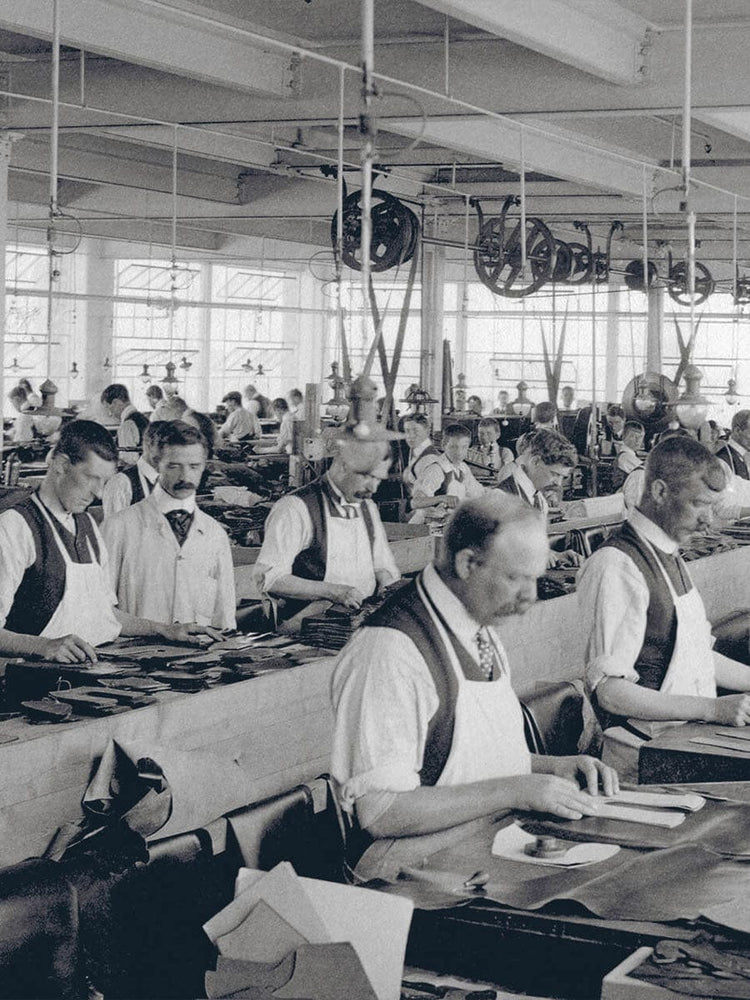 Leathers were cut at the factory before being distributed to out-workers, who would take the parts home, complete their process and then return all components to the factory, where the shoes or boots could be completed.